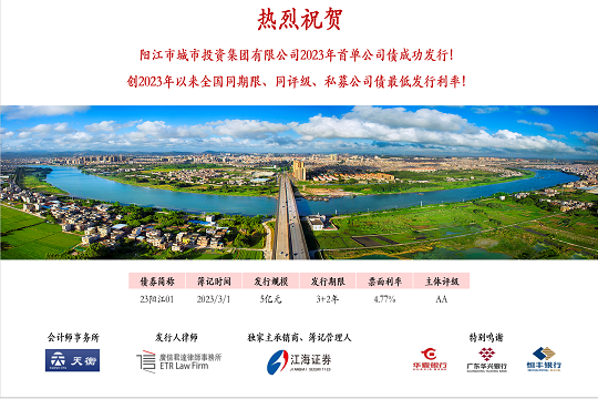 2024年1月19日,市城投集團在深圳證券交易所成功發行“陽江市城市投資集團有限公司2024年面向專業投資者非公開發行公司債券”。本期債券發行規模為5.5億元,期限為5(3+2)年,票面利率3.10%,全場認購倍數超過4.8倍,是...